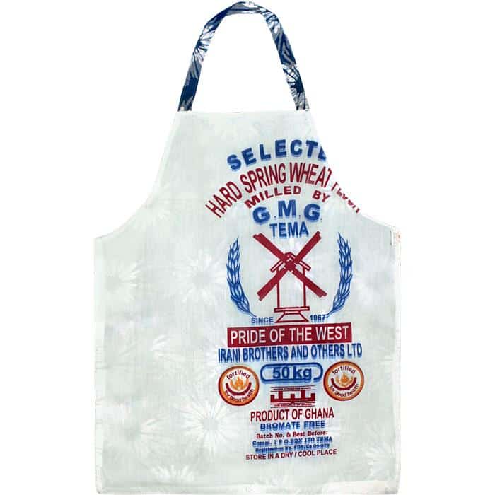 2. Mehlsäcke bestehen aus einem extrem fein gewobenen Stoff der einst Mehlstaub vermieden hat und nun davor schützt, dass Fett oder Wasser sofort durch die Schürze dringen.