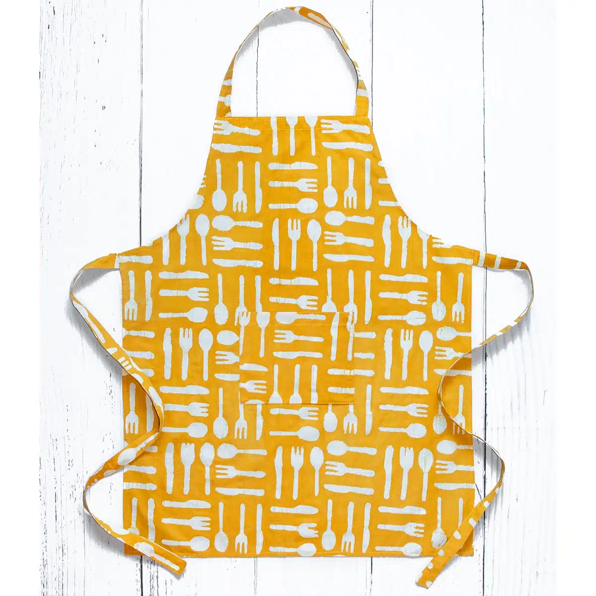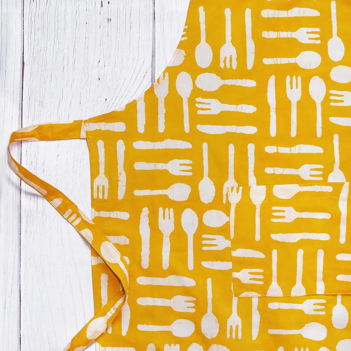 Bunte Wende-Schürze, die Funktionalität und Flair vereint! Vorderseite 100% Bio-Baumwolle. Rückseite Upcycling-Mehlsack der 3 tolle Eigenschaften vereint:
