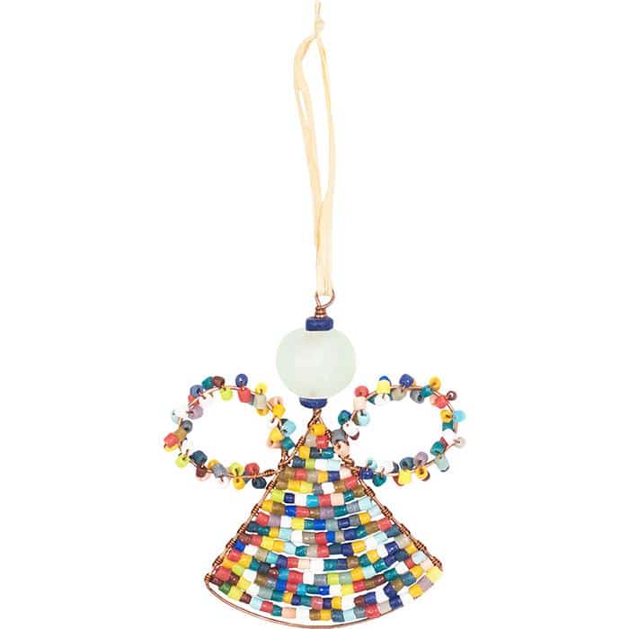 Beads made from recycled glass. Wire framework and loop for hanging. ~3.5” tall with 2” raffia loop.