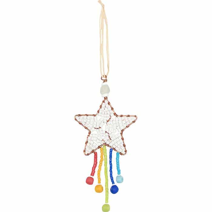 Beads made from recycled glass. Wire framework and loop for hanging. ~ 15cm tall with ~ 5cm raffia loop.