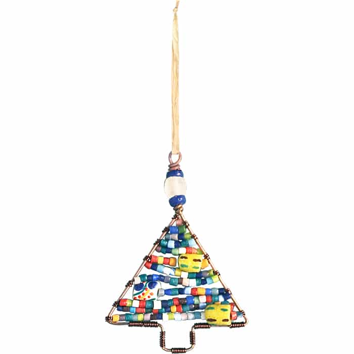 Beads made from recycled glass. Wire framework and loop for hanging. ~ 10cm tall with ~ 5cm raffia loop.