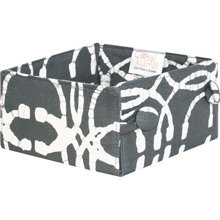Four sides fold up and button together. Reinforced to hold shape. Stores flat. 6?L x 6?W x 3?H. 100% organic cotton shell.