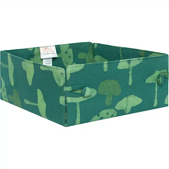 Four sides fold up and button together. Reinforced to hold shape. 7.5? x 7.5? x 4? assembled. 100% organic cotton shell.