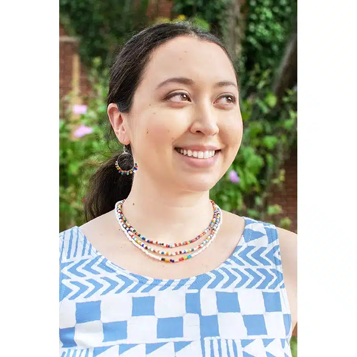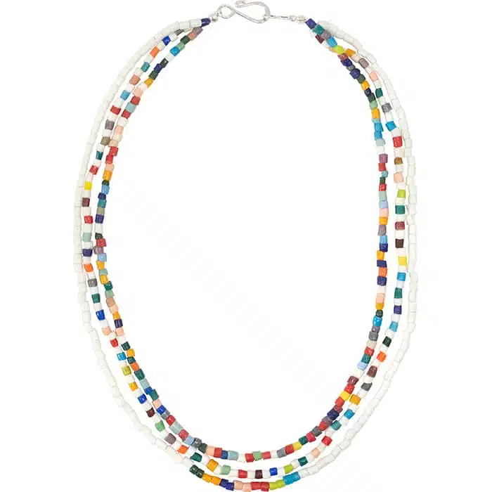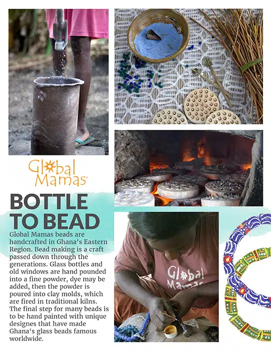 Global Mamas’ beads are made from recycled glass. Due to each piece’s individuality, all sizes and lengths are approximate. Necklace findings are silver plated. Three strands with inside strand ~17″/~43cm and longest strand (~49cm).