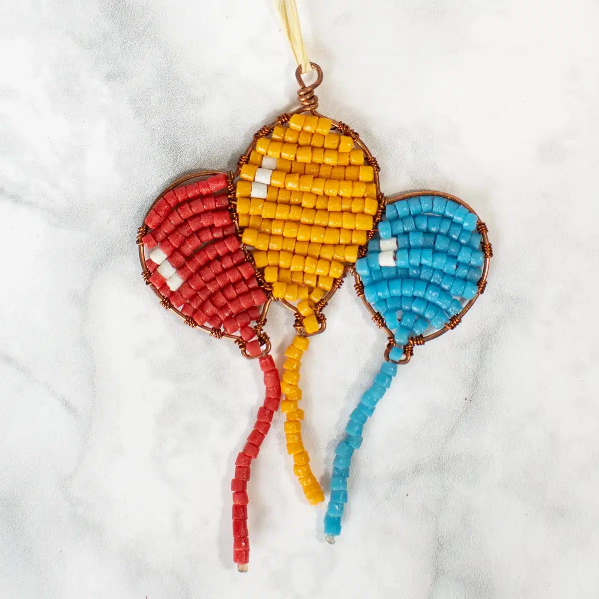 Beads made from recycled glass. Wire framework and loop for hanging. ~4″ tall with 2� raffia loop.