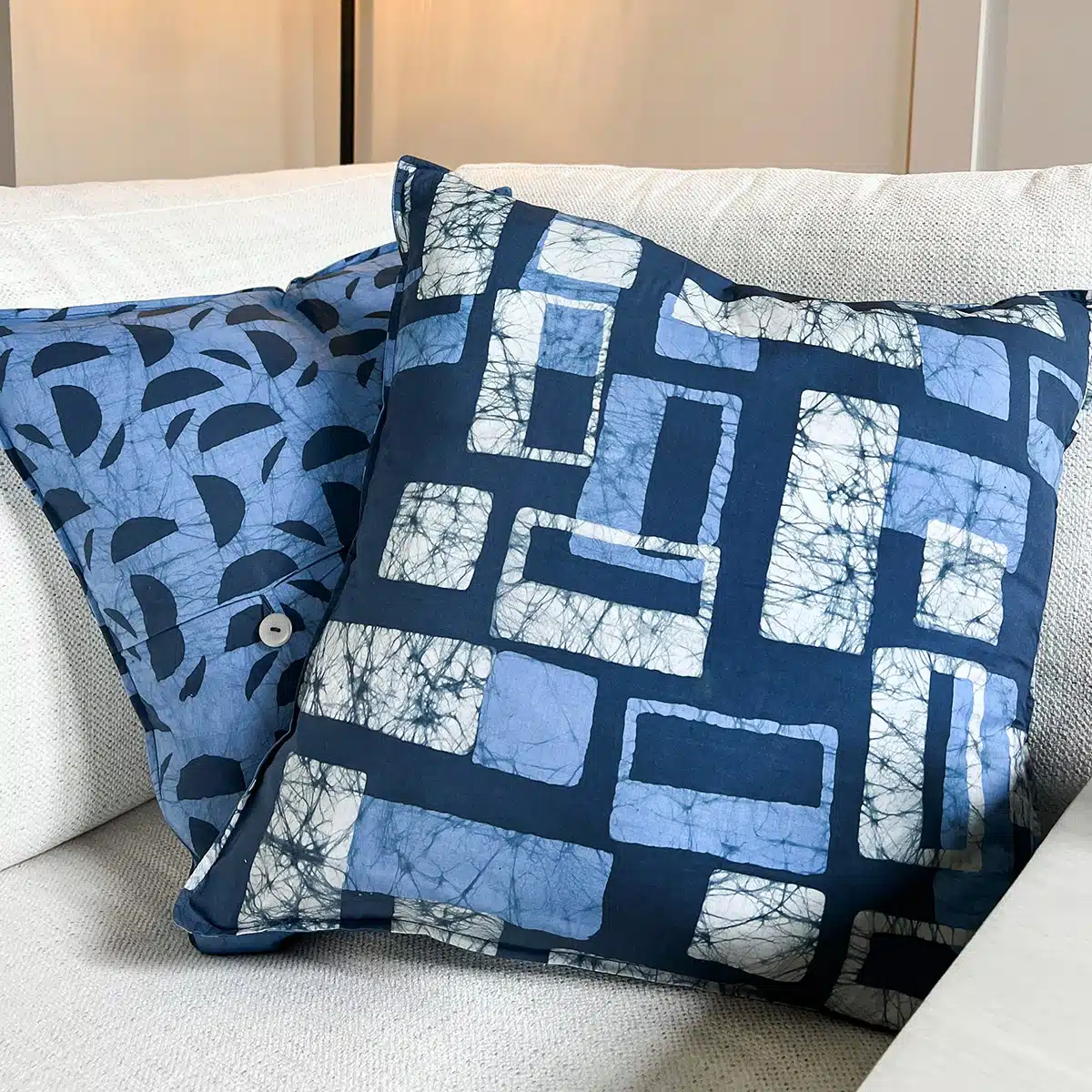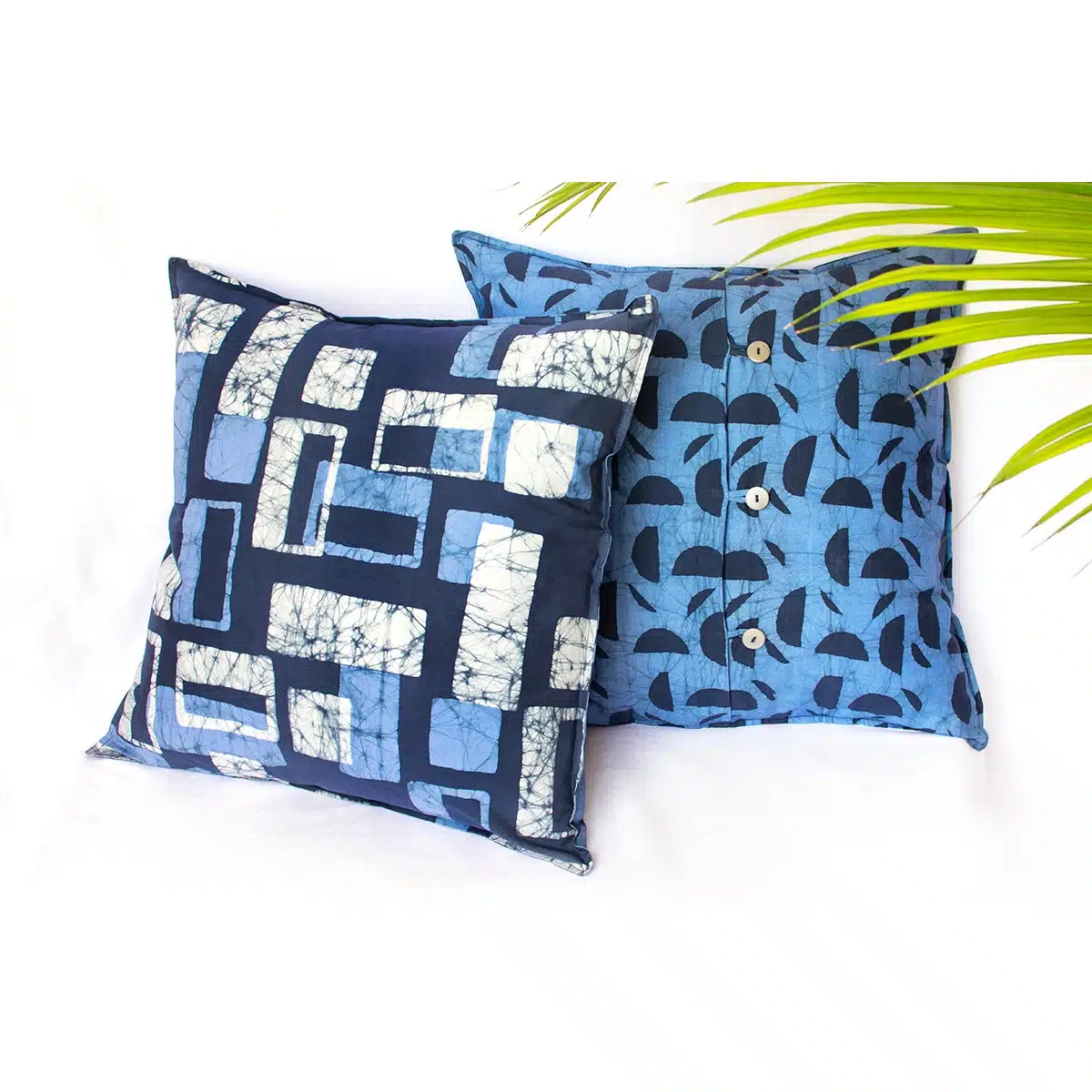 Ein Kissen – zwei tolle Looks, die Stimmung und Farbe in die Wohnung zaubern. Die beiden Prints auf Vorder- und Rückseite ergänzen sich, erzeugen Spannung und zeigen die Kreativität der Batikerinnen von Global Mamas.