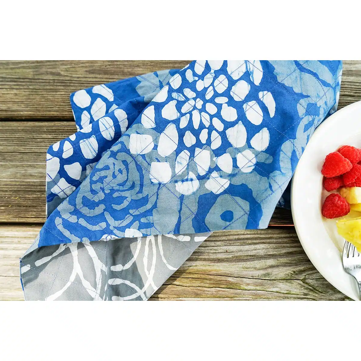 - Doppellagig mit kontrastierenden Batikmustern. Dekorative Ziernähte